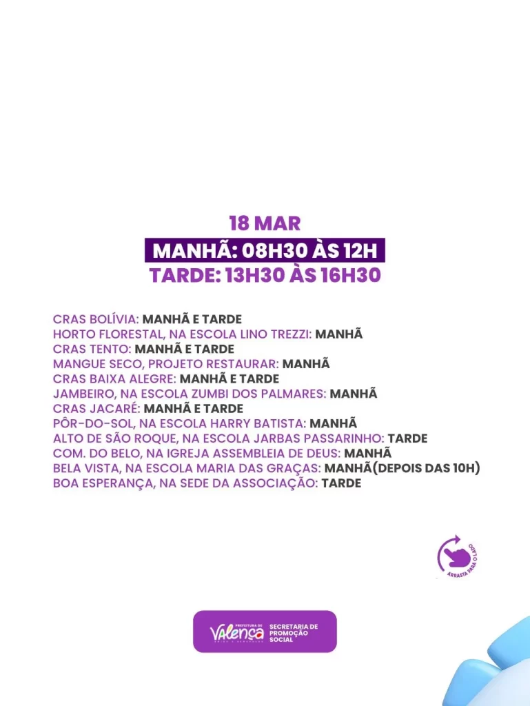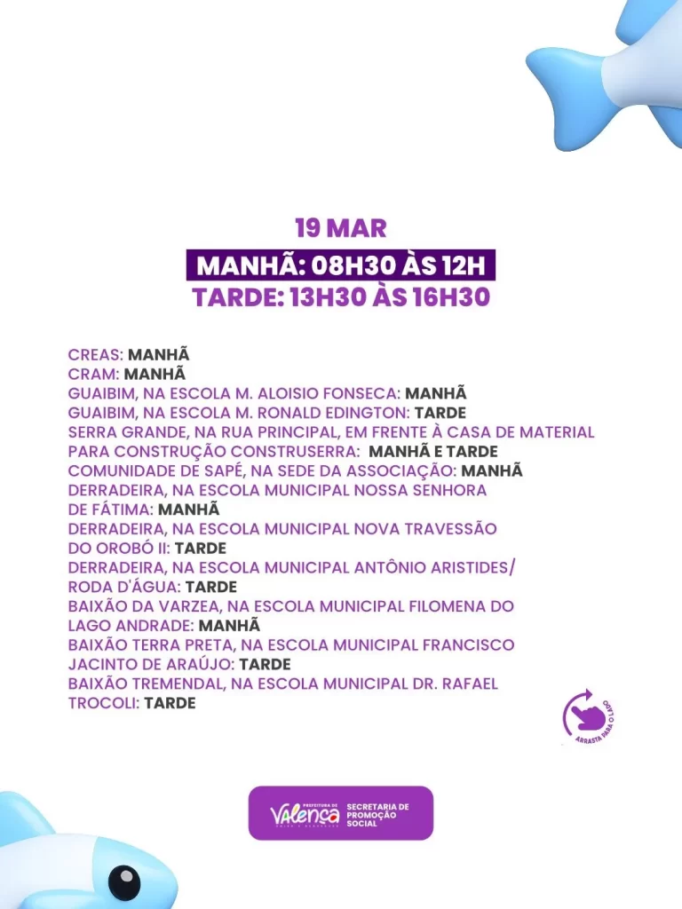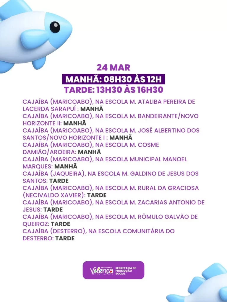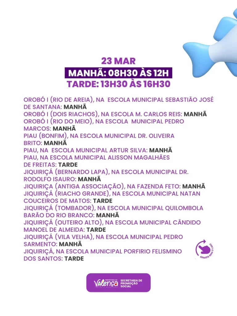 A Prefeitura de Valença, por meio da Secretaria de Promoção Social, divulgou nesta terça-feira (17) o cronograma oficial com locais e horários da tradicional entrega de peixes da Semana Santa. A ação é destinada exclusivamente às famílias que realizaram cadastro nas duas etapas anteriores, amplamente divulgadas nas redes sociais, ocorridas entre os dias 23 e 26 de fevereiro e de 2 a 5 de março.