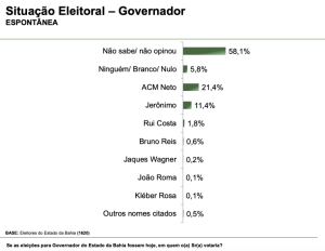 Na pesquisa espontânea, em que os nomes dos candidatos não são apresentados, Neto lidera com 21,4% das intenções de voto, seguido pelo atual governador Jerônimo Rodrigues (PT), com 11,4%. Outros nomes citados foram Rui Costa (1,8%), Bruno Reis (0,6%), Jaques Wagner (0,2%) e João Roma (0,1%). Um total de 58,1% dos eleitores não soube ou preferiu não opinar.