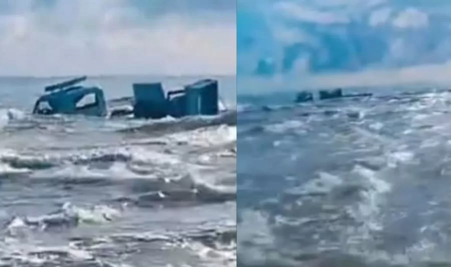 Na noite desta segunda-feira (02), um caminhão carregado com equipamentos para a tradicional Festa de Iemanjá saiu da pista e foi parar dentro do mar após realizar uma curva de modo errado.