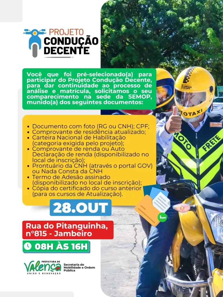 A Prefeitura de Valença, por meio da Secretaria de Mobilidade e Ordem Pública (SEMOP), informa que os candidatos pré-selecionados para o Projeto Condução Decente devem comparecer à unidade local para dar continuidade ao processo de análise e matrícula.