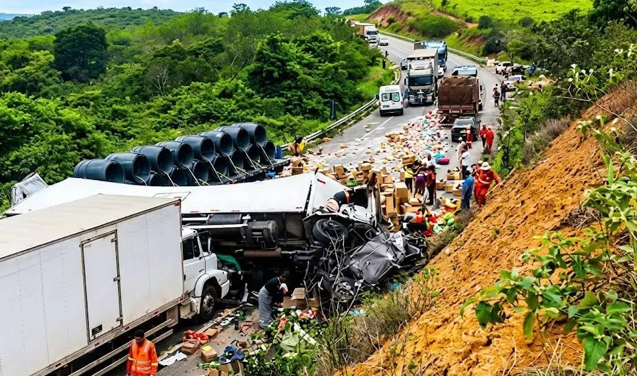 Com o impacto, parte da carga ficou espalhada pela pista. De acordo com a Polícia Rodoviária Federal (PRF), o veículo tombou e, na sequência, colidiu com um caminhão e um carro de passeio. Parte da carga ficou espalhada pela pista.