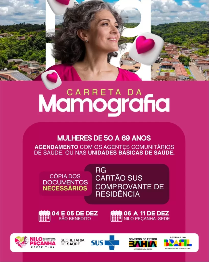 A Prefeitura de Nilo Peçanha, em parceria com o Governo do Estado da Bahia, vai receber nos próximos dias a Carreta da Mamografia, uma importante ação de saúde voltada para a prevenção e o diagnóstico precoce do câncer de mama.