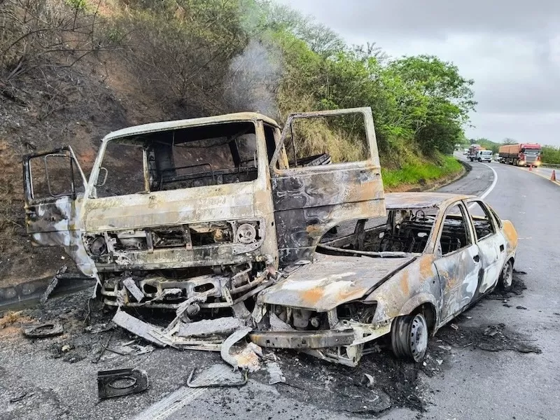 O acidente envolveu um veículo de passeio e um caminhão, ambos pegaram fogo após o impacto da colisão.