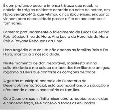 Em nota, o gestor lamentou as mortes e se solidarizou com as famílias. “Uma tragédia que enluta não apenas as famílias Reis e da Hora, mas toda a nossa cidade”.