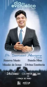 A partir das 16h, a Praça do Povo será o palco do evento. Este ano, a festa contará com participação do Pr. Samuel Mariano e Banda, como atração principal. Além dele, o dia do evangélico terá apresentações da Banda Hius, Renova Music, Missão de Jesus e Divina Essência.