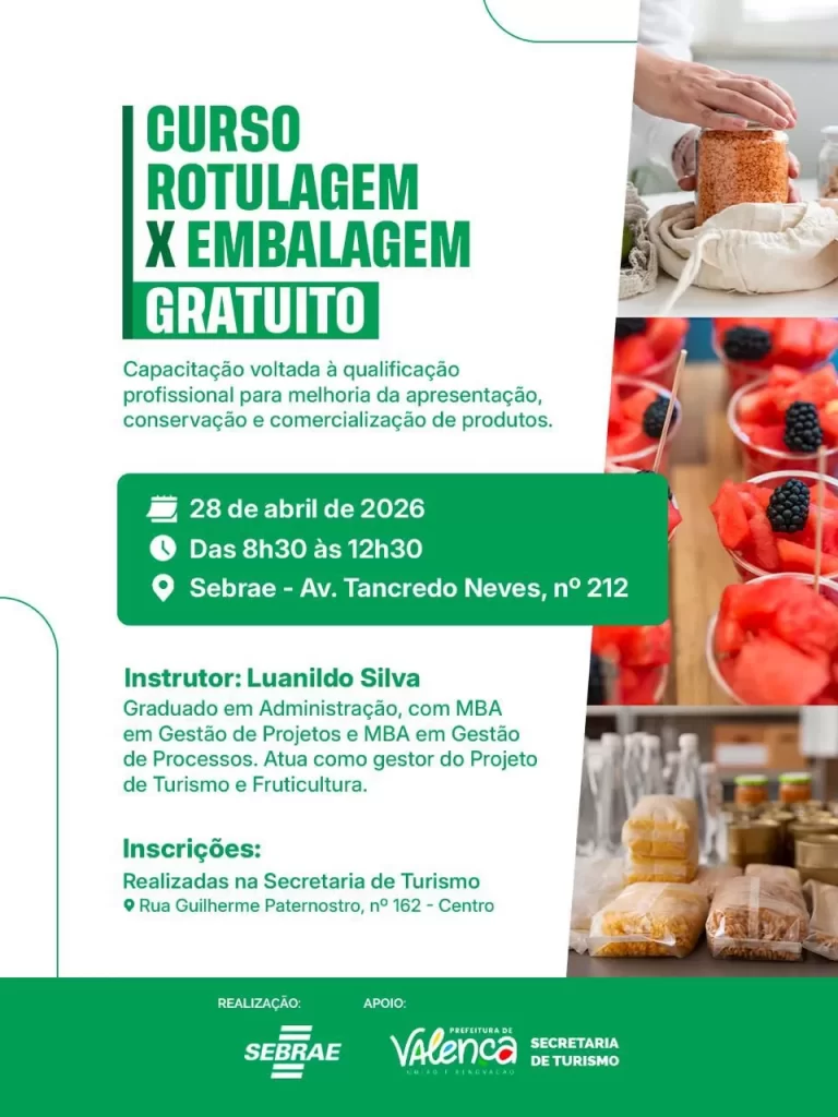 Estão abertas as inscrições para o Curso Gratuito de Rotulagem x Embalagem, uma capacitação voltada à qualificação profissional, com foco na melhoria da apresentação, conservação e comercialização de produtos.