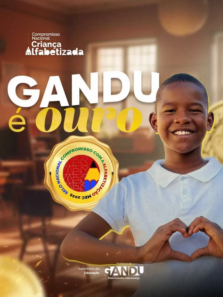 A educação de Gandu foi mais uma vez premiada com o Selo Nacional Compromisso com a Alfabetização, na categoria ouro. Essa é a segunda vez que o município recebe o reconhecimento máximo do MEC (Ministério da Educação) pelo trabalho desenvolvido com excelência pela Secretaria Municipal da Educação na alfabetização das crianças ganduenses, celebrando os avanços alcançados ao longo do ano de 2025.
