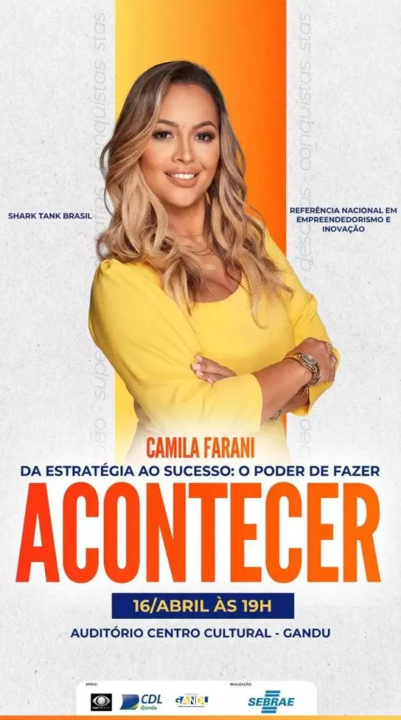 Será realizada no próximo dia 16 de abril, no Centro Educacional e Cultural, mais uma grande palestra voltada ao empreendedorismo. Gandu vai receber pela primeira vez no município, Camila Farani, empreendedora e investidora do Shark Tank Brasil.