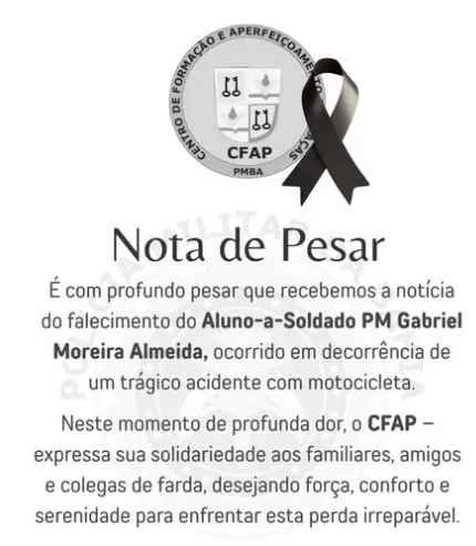Em nota, o Centro de Formação e Aperfeiçoamento de Praças (CFAP) da Polícia Militar lamentou o acidente e expressou solidariedade aos familiares, amigos e colegas de Gabriel.