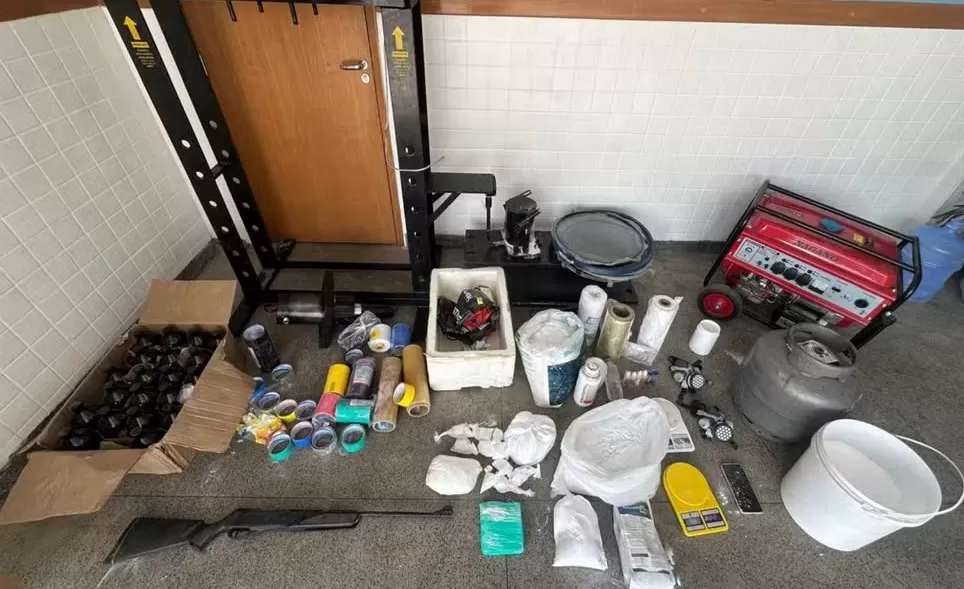 Durante o patrulhamento na região, os policiais localizaram uma casa que funcionava como laboratório e encontraram materiais utilizados no refino de drogas.