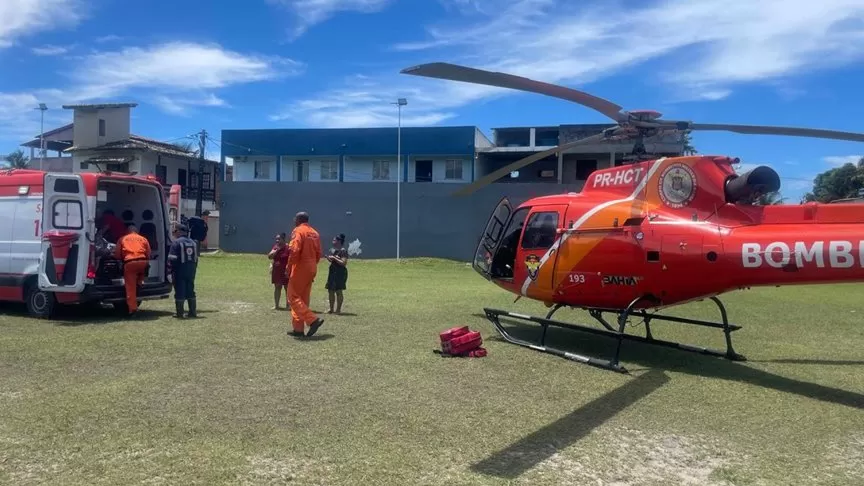 Diante da gravidade do quadro e da necessidade de transporte rápido, o Grupamento de Operações Aéreas (GOA) do Corpo de Bombeiros Militar da Bahia (CBMBA) realizou uma remoção aeromédica na praia de Aratuba, na Ilha de Itaparica, na manhã desta quarta-feira (8).