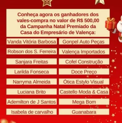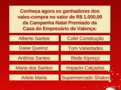 A Casa do Empresário de Valença, divulgou o nome dos ganhadores da campanha Natal Premiado 2025, em Valença.