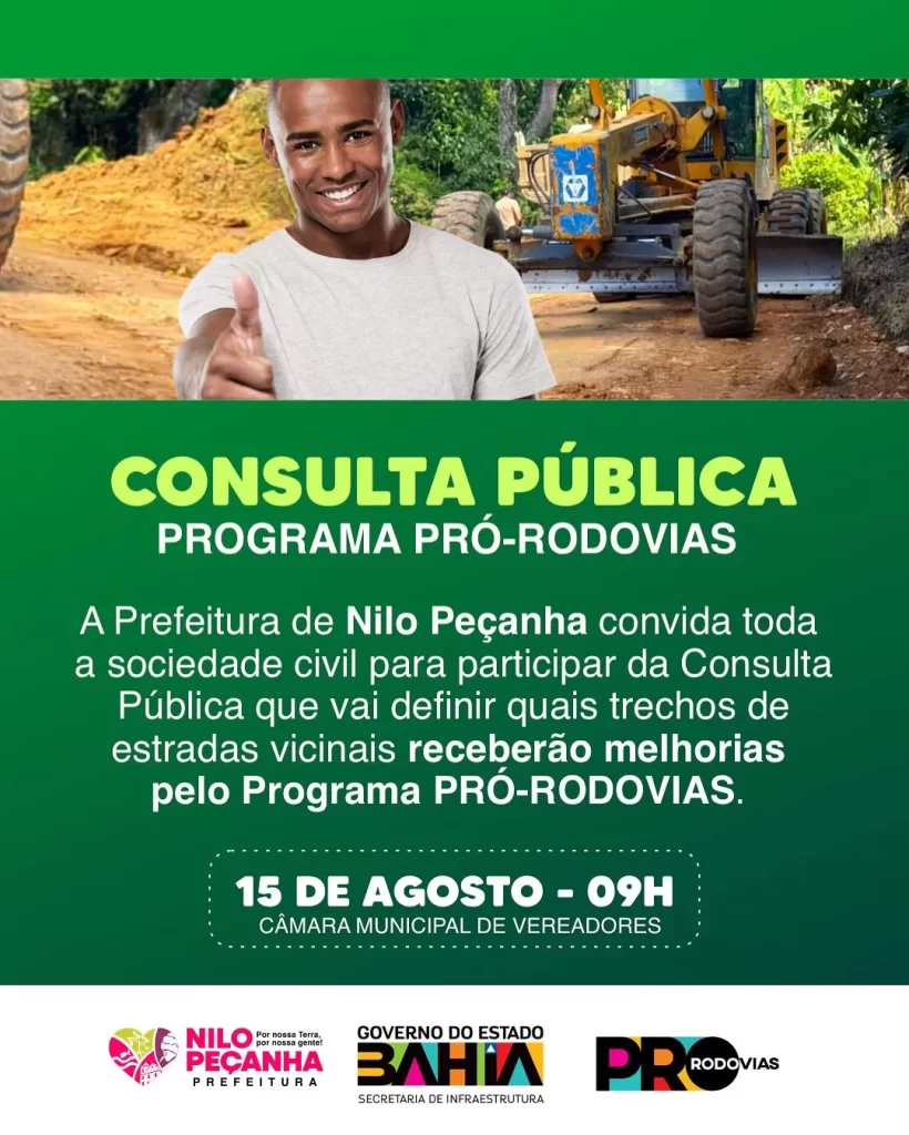 A Prefeitura de Nilo Peçanha anunciou a realização de uma Consulta Pública para ouvir a comunidade sobre quais trechos de estradas vicinais serão contemplados com melhorias pelo Programa Pro-Rodovias. O encontro acontece nesta sexta-feira, 15 de agosto, às 9h, na Câmara Municipal de Vereadores.