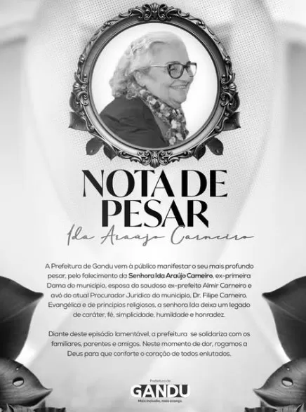 A Prefeitura de Gandu vem a público manifestar o seu mais profundo pesar, pelo falecimento da Senhora Ida Araújo Carneiro, ex-primeira Dama do município, esposa do saudoso ex-prefeito Almir Carneiro e avó do atual Procurador Jurídico do município, Dr. Filipe Carneiro.
