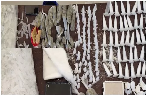 Foram encontradas duas sacolas contendo 52 buchas de maconha, 132 pinos de cocaina, e 2 pedras de crack, além de balança de precisão e material para embalar a droga.