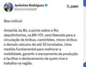 O governador da Bahia, Jerônimo Rodrigues (PT), anunciou neste domingo, 21, a liberação do tráfego na ponte sobre o Rio Jequitinhonha, localizada na BR-101.