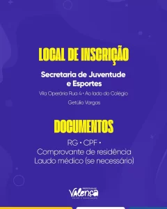 As matrículas serão realizadas presencialmente, de 26 a 30 de janeiro, na Secretaria de Juventude e Esportes, localizada na Vila Operária, Rua 4, ao lado do Colégio Getúlio Vargas. Para efetivar a inscrição, é necessário apresentar RG, CPF, comprovante de residência e, quando solicitado, laudo médico.
