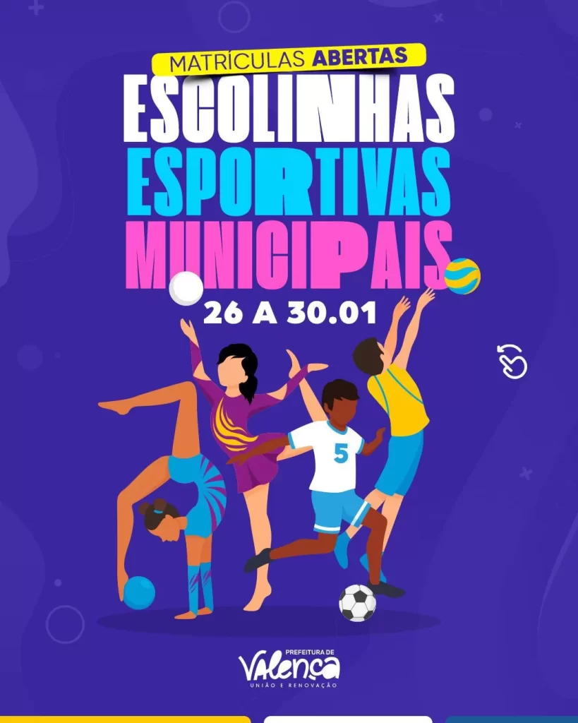A Prefeitura de Valença, por meio da Secretaria de Juventude e Esportes, abre, de 26 a 30 de janeiro, as matrículas para as Escolinhas Esportivas Municipais, que oferecem modalidades gratuitas e incentivam o esporte como instrumento de inclusão social, qualidade de vida e disciplina.
