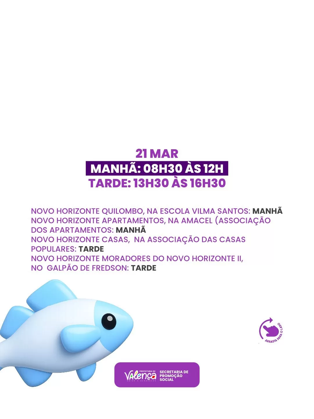 A Prefeitura de Valença, por meio da Secretaria de Promoção Social, divulgou nesta terça-feira (17) o cronograma oficial com locais e horários da tradicional entrega de peixes da Semana Santa. A ação é destinada exclusivamente às famílias que realizaram cadastro nas duas etapas anteriores, amplamente divulgadas nas redes sociais, ocorridas entre os dias 23 e 26 de fevereiro e de 2 a 5 de março.