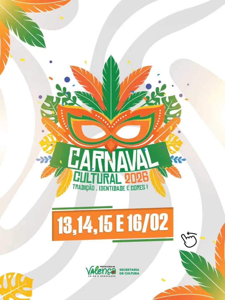 A Prefeitura de Valença, através da Secretaria de Cultura, divulgou nesta quinta-feira (12), a grade oficial do Carnaval Cultural 2026, que traz o tema: “Tradição, Identidade e Cores”. A programação descentralizada começa nesta sexta-feira (13) no bairro do Tento, com a Puxada do Boi Ventania a partir das 16 horas, e segue durante o final de semana e feriadão de Carnaval com atrações concentradas na Praia de Guaibim e no Povoado do Bonfim.