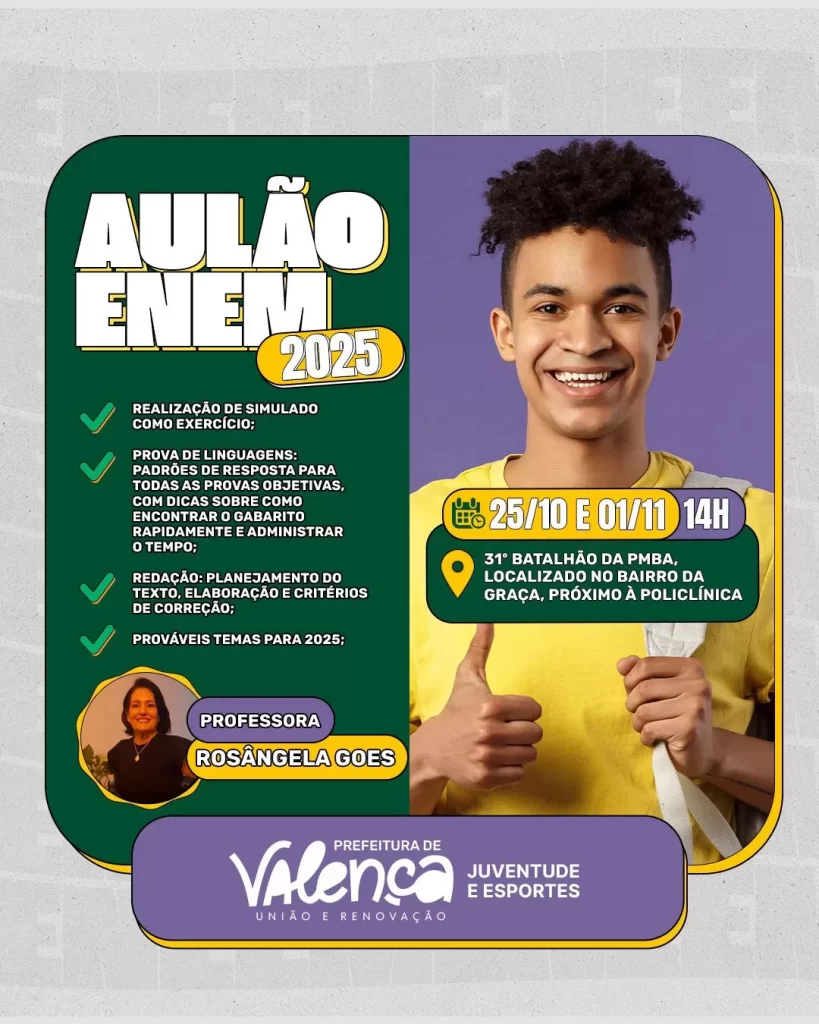 A Prefeitura de Valença, por meio da Secretaria de Juventude e Esportes, promoverá um aulão preparatório para o ENEM 2025, voltado aos estudantes que irão participar do exame nacional. O evento ocorrerá nos dias 25 de outubro e 1º de novembro, a partir das 14h, no 31º Batalhão da Polícia Militar da Bahia (PMBA), localizado no bairro da Graça, próximo à Policlínica.