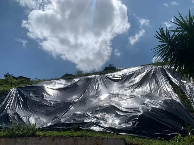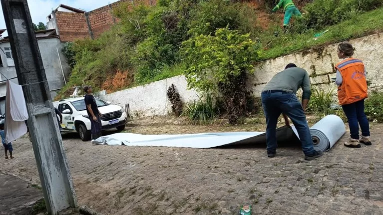 Como medida inicial e emergencial, foi realizada a proteção da encosta com a instalação de lonas, com o objetivo de reduzir os impactos das chuvas e garantir maior segurança à população.