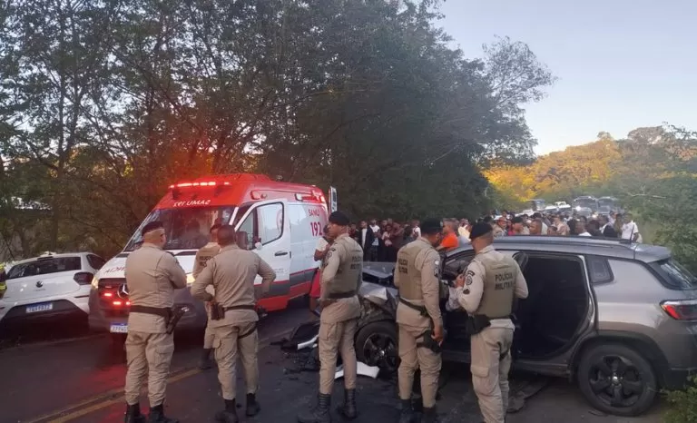 A colisão frontal mobilizou equipes de resgate e agentes da Polícia Rodoviária Estadual, que atuam no socorro às vítimas e na organização do trânsito.