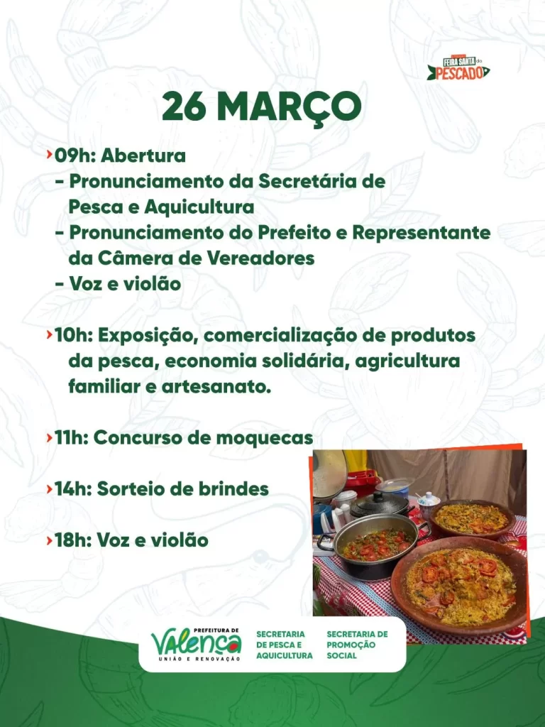 A secretária de Pesca e Aquicultura, Cristiane Oiticica, reforça o convite à população: “Convidamos toda a comunidade valenciana e visitantes a participarem da Feira Santa do Pescado, um espaço que valoriza nossos trabalhadores do mar e do campo e fortalece a economia local. Venham prestigiar, adquirir produtos de qualidade e viver esse momento especial da nossa tradição durante a Semana Santa.”