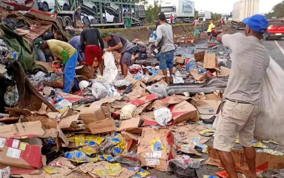 Um grupo de pessoas saqueou parte da carga, que estava espalhada pela pista.