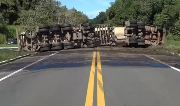 O veículo foi removido da pista no início da noite de terça (8), mas a via só deve ser liberada após a limpeza dos combustíveis derramados na rodovia após o tombamento.