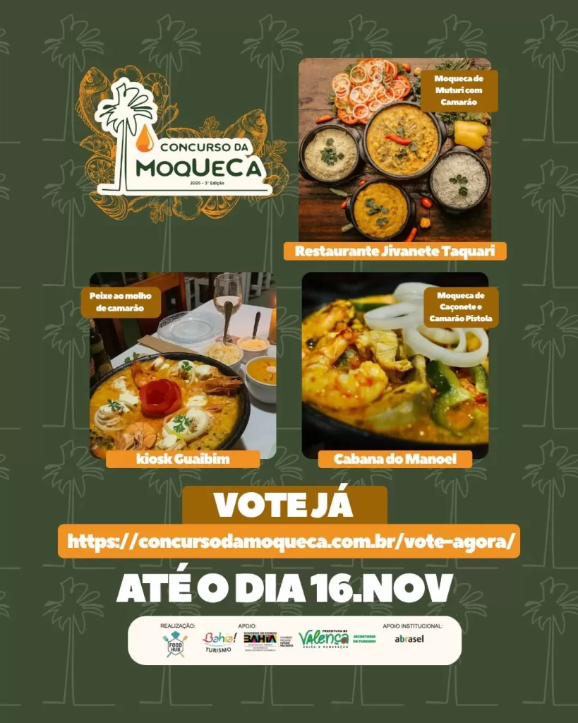 O público pode participar votando em sua moqueca favorita até o dia 16 de novembro, no site concursodamoqueca.com.br. É uma oportunidade para descobrir novos sabores, apoiar os restaurantes locais e celebrar a força da cultura baiana.