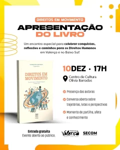 A partir das 17h, também no Centro de Cultura Olívia Barradas, acontece a apresentação oficial do livro Direitos em Movimento. O momento reunirá as autoras para uma conversa aberta sobre trajetórias, lutas, perspectivas e conquistas relacionadas aos Direitos Humanos em Valença e em toda a região do Baixo Sul.