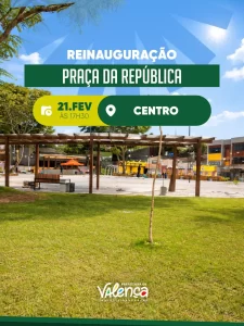Ainda no sábado, às 17h30, é a vez da Nova Praça da República abrir oficialmente suas portas para a população. Com investimento de mais de R$ 2 milhões, aplicados com recursos próprios, este projeto conta com iluminação moderna em LED, valorização e manutenção do coreto, fonte iluminada, ciclovia, novo paisagismo, playground e espaço estruturado para food trucks, fortalecendo também a economia local.