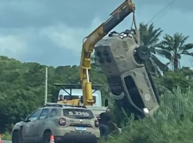 Com o impacto, a viatura da Polícia Militar perdeu o controle, saiu da pista e acabou tombando às margens da rodovia.